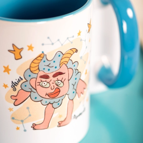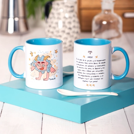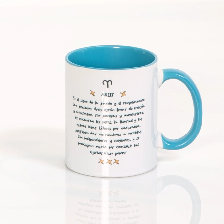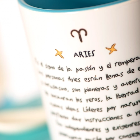 ¿Has nacido entre el 21 de Marzo y el 20 de Abril? ¡Enhorabuena! Inauguras el zodiaco amig@ Aries. Nuestro carnero yosiquesero representa a este signo de maravilla, con su energía y entusiasmo, su pasión y su temperamento. La astrología nos dice que sois personas muy independientes y exigentes, y os encantan las aventuras, los retos y la libertad. En esta taza con color en asa e interior te explicamos con detalle esa personalidad tuya tan arrolladora. ¡Eres puro power!