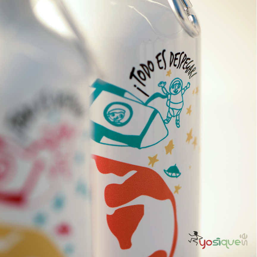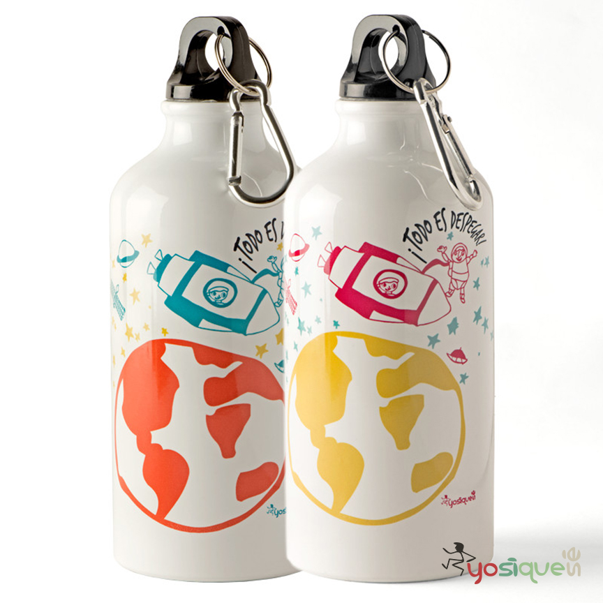 Y aquí tenéis la botella intergaláctica para el bocata del cole y merendillas en el parque más divertidas de la galaxia. Para que vuestros chic@s crezcan sanos y fuertes, y despeguen del suelo como un cohete. Que el que no come se queda chico…