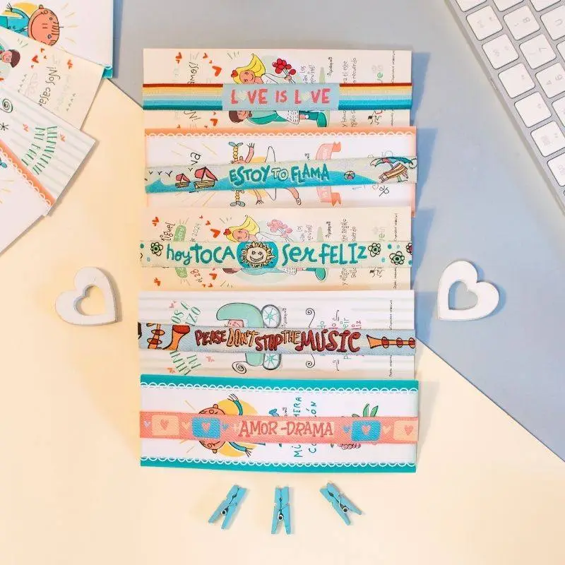 Características: 5 Pulseras de tela bordada con cierre autoajustable.