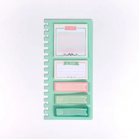 Características: 5 juegos de notas adhesivas de 30 hojas en papel offset de 120gr. Impreso a color a dos caras con troquel wire-o extraíble. Dimensiones: 100x210 mm.