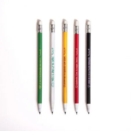 Características: Portaminas recargable con goma. Incluye dos recargas de 0,7 mm. Material: plástico. Medidas 16 cm de alto y 5 cm de diámetro. Disponible en cinco colores.