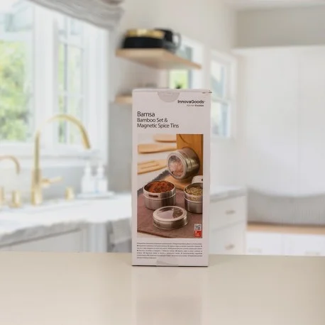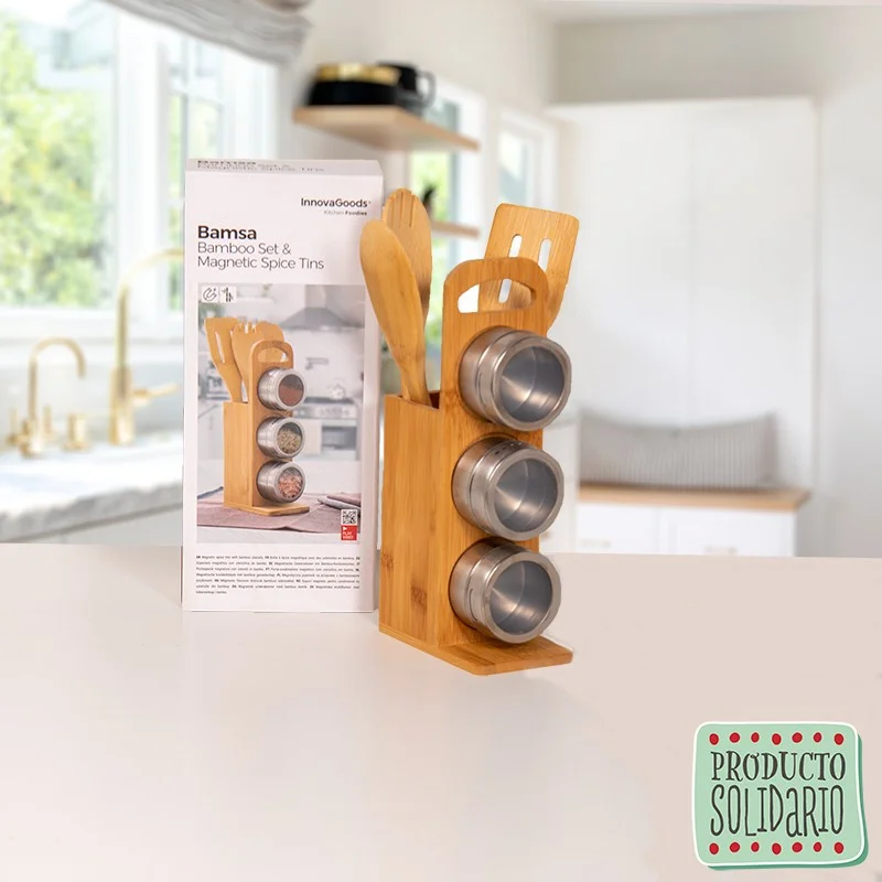 ¿Eres el masterchef de casa? no te puedes perder este nuevo gadget para tu cocina, este especiero de diseño funcional y elegante que harán que tus platos sean dignos de una estrella Michelin. Elaborado con materiales de alta calidad y con un innovador y magnético" diseño. ¡Enamora a tod@s con tu lado más gourmet! Características: •Material: bambú, acero inoxidabble. •Diseño innovador y funcional. •Tres utensilios de cocina de bambú: paleta, cuchara y tenedor. •Soporte de bambú. •Tres especieros magnéticos: Ø6 x 4 cm. •Tapas transparentes giratorias para visualizar el contenido. •Salida regulable del condimento (de 1 a 4 orificios o ranura). •Medidas aprox.: 12 x 30 x 8 cm."